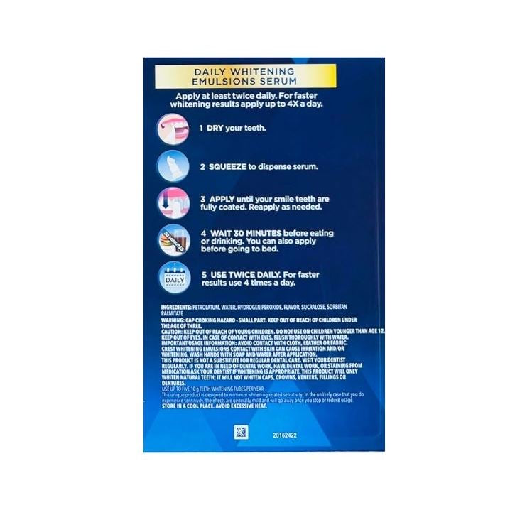 You've never seen teeth whitening like this! The all-new Crest Whitening Emulsions is a breakthrough formula featuring a thin layer of highly active peroxide droplets suspended in a hydrating base to whiten teeth with virtually no sensitivity. This means it applies in seconds and stays on teeth longer* to continue whitening long after you apply, with no need to rinse or brush off. This convenient, pocket size tube with a built-in applicator is great for whitening your teeth throughout the day. Just apply on your teeth and go! Crest Whitening Emulsions removes stains and leaves your teeth 100% whiter*. *vs ARC pen whitening