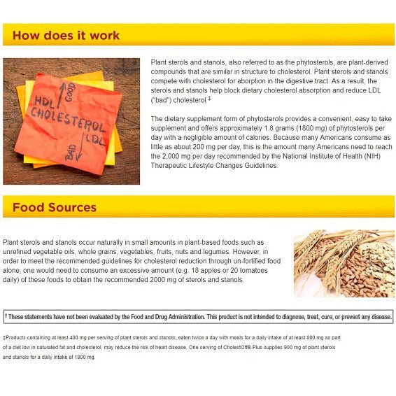 900 mg. Plant Sterols And Stanols per Serving. Clinically Proven to Lower Cholesterol. Take 2 Softgels Twice Daily With Water at Your Two Largest .Meals USP Verified. Nature Made CholestOff® Plus is made with Reducol™, a proprietary blend of plant-based sterols and stanols (also called phytosterols). Sterols and stanols work to help reduce cholesterol absorption and reduce LDL (bad) cholesterol in the bloodstream.‡ CholestOff® Plus is an option for your cholesterol management program, along with a diet low in saturated fat and cholesterol.1 ,2 ‡ One serving of Nature Made CholestOff® Plus supplies 900 mg of plant sterols and stanols for a daily intake of 1800 mg. 900 mg of plant sterols and stanols per serving. Clinically proven to lower cholesterol.‡ A safe and effective part of a cholesterol management program.‡ #1 Pharmacist Recommended Vitamin and Supplement Brand* Plant sterols and stanols, also referred to as the phytosterols, are plant-derived compounds that are similar in structure to cholesterol. Plant sterols and stanols compete with cholesterol for absorption in the digestive tract. As a result, the sterols and stanols help block dietary cholesterol absorption and reduce LDL (“bad”) cholesterol.‡